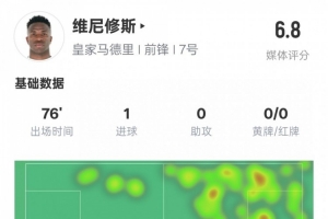維尼修斯本場比賽數(shù)據(jù)如下: