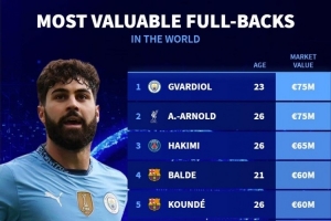 體育資訊4月6日訊 德國(guó)轉(zhuǎn)會(huì)市場(chǎng)排出了邊衛(wèi)球員身價(jià)榜單,格瓦迪奧爾、阿諾德7500萬(wàn)歐居首,阿什拉夫6500萬(wàn)歐第三。