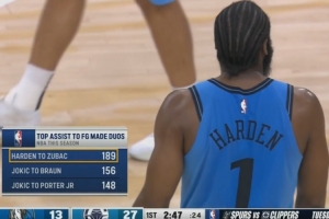 轉播方給到一組數(shù)據(jù),本賽季哈登助攻祖巴茨打進189球,聯(lián)盟最多,排在第二和第三的都是約基奇,他分別助攻布勞恩和小波特進了156球和148球。