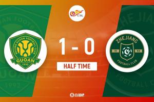 上半場(chǎng)補(bǔ)時(shí)3分鐘。半場(chǎng)戰(zhàn)罷,國安1-0浙江。