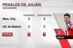 據(jù)ESPN統(tǒng)計(jì),阿爾瓦雷斯登陸歐洲聯(lián)賽以來(lái)7次主罰點(diǎn)球,全部命中,其中包括曼城4球、馬競(jìng)3球。