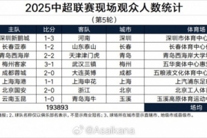 2025中超聯(lián)賽第5輪所有比賽現(xiàn)場(chǎng)觀眾人數(shù)統(tǒng)計(jì)如下(主隊(duì)在前):
