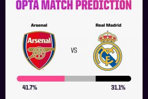 預(yù)測(cè)中,阿森納首回合主場(chǎng)取勝的概率為41.7%,皇馬客場(chǎng)贏球的概率則是31.1%,兩隊(duì)有27.2%的可能戰(zhàn)平。