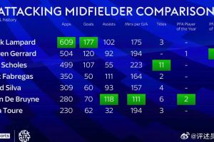 英超時代進攻中場球星的橫向?qū)Ρ葓D。進球最多的是蘭帕德;唯一沒拿過英超冠軍的杰拉德是入選職業(yè)球員工會賽季最佳陣容次數(shù)最多的;斯科爾斯收獲的英超冠軍最多;德布勞內(nèi)則是助攻最多、直接參與進球效率最高而且兩次拿到賽季最佳球員的獎項。如果這七大中場在451的陣型中挑選五位首發(fā),你的選擇會是.............? 太難了!個人選杰拉德單后腰,大衛(wèi)-席爾瓦和德布勞內(nèi)分居兩側(cè),中間是斯科爾斯和蘭帕德。
