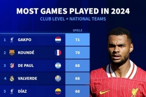 體育資訊1月3日訊 德國轉(zhuǎn)會市場統(tǒng)計了2024年球員在俱樂部和國家隊參加的比賽場次,并列出榜單,加克波71場居首,孔德70場次席,前10名利物浦球員占4席。