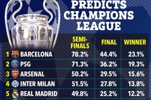 體育資訊4月8日訊?歐冠1/4決賽首回合,阿森納主場對陣皇馬,拜仁主場對陣國米。賽前,超算預測了歐冠晉級概率。