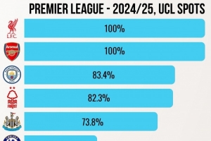 體育資訊4月8日訊 Foot Rankings列出了英超歐冠資格最新概率,曼城83.4%,諾丁漢森林82.3%,切爾西降至40.3%。