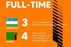 贊比亞女足在上半場(chǎng)建議了3-0的領(lǐng)先優(yōu)勢(shì)。易邊再戰(zhàn),烏茲別克斯坦女足扳回一球后,贊比亞女足再入一球,將比分?jǐn)U大為4-1。全場(chǎng)補(bǔ)時(shí)階段,烏茲別克斯坦女足球員哈比布拉耶娃連入兩球,將比分追至3-4,但最終仍為時(shí)已晚,烏茲別克斯坦女足3-4遺憾輸球。