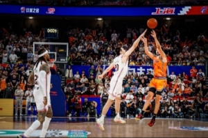 計(jì)時(shí)器還剩最后的1.6秒就要走完,王少杰使出吃奶的勁手腳并用,試圖阻止劉錚發(fā)出邊線球,但經(jīng)驗(yàn)老到的劉錚并沒(méi)有被他的長(zhǎng)手長(zhǎng)臂影響判斷,他精準(zhǔn)找到繞出空間接球的泰勒-哈維,后者在中場(chǎng)logo前接球、轉(zhuǎn)身、立刻出手,一氣呵成,球在空中滑翔,計(jì)時(shí)器歸零,然后軌跡像計(jì)算好一樣掉入籃筐,上海隊(duì)完成絕殺。