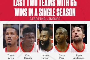他們也成為2017-18賽季火箭后首支65勝球隊,當時火箭的首發(fā)陣容為:阿里扎、卡佩拉、哈登、保羅和萊恩-安德森。