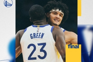 賽后勇士官方曬出贏球海報,追夢和桑托斯登上封面。
