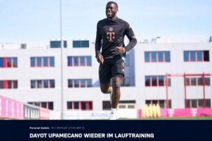 體育資訊4月9日訊 拜仁官方消息,后衛(wèi)于帕梅卡諾恢復跑步訓練。