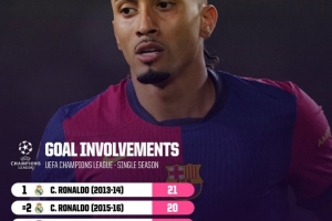 OPTA也盤點(diǎn)了單賽季歐冠參與進(jìn)球榜,其中本賽季拉菲尼亞已經(jīng)可以排在并列第4位,具體如下: