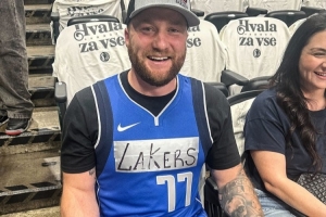 現(xiàn)場(chǎng)一位球迷將東契奇的獨(dú)行俠77號(hào)球衣簡(jiǎn)易改裝,直接化身湖人球迷??。