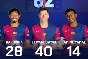 巴薩——拉菲尼亞28球+萊萬(wàn)40球+亞馬爾14球=82球