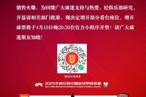 重慶銅梁龍官方:因4月12日重慶銅梁龍VS陜西聯(lián)合月亮泊賽事球票銷售火爆,為回饋廣大球迷支持與熱愛,經(jīng)俱樂部研究并懇請相關(guān)部門批準(zhǔn),現(xiàn)決定增開部分看臺座位,增開球票將于4月10日晚20:30在官方小程序開售!請廣大球迷朋友知曉。