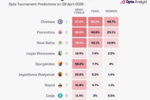 佛羅倫薩有23.1%的概率奪冠,排在第二位,貝蒂斯19.9%的概率奪冠排在第三。至于第四的華沙萊吉亞,奪冠概率僅為2.3%,他們?cè)?/4決賽的對(duì)手是切爾西。