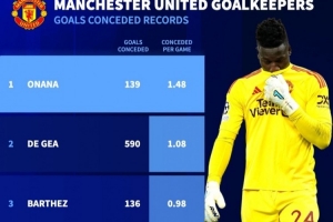 據(jù)德轉統(tǒng)計,加上本場比賽,奧納納在加盟曼聯(lián)后,已經被139次洞穿大門,場均丟球數(shù)達1.48個,場均丟球數(shù)高于第二位的德赫亞0.4個。