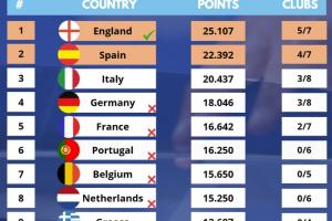 24/25賽季各聯(lián)賽歐戰(zhàn)積分(前2名獲額外歐冠名額):