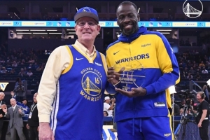 賽前勇士球星追夢(mèng)領(lǐng)取了上個(gè)月月最佳防守球員的獎(jiǎng)杯。