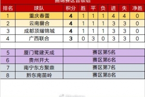 本賽區(qū)最終排名如下:1重慶春蕾(晉級(jí))、2云南爨合(待定)、3成都頂耀錦城、4廣西聯(lián)合、5廈門鷺建天成、6貴州開大、7南寧東方聚鼎、8黔東南苗嶺。