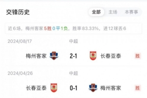 本場比賽之前,長春亞泰對陣梅州客家遭遇5連敗。在2024賽季中超聯(lián)賽中,亞泰客場1-2不敵梅州客家、主場0-1輸給梅州客家。在2023賽季中超聯(lián)賽中,亞泰主客場均2-4不敵梅州客家。在2022賽季中超聯(lián)賽中,長春亞泰客場0-1不敵梅州客家。