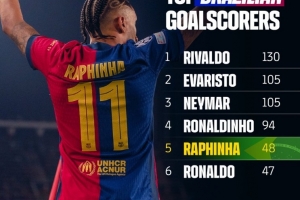 體育資訊4月11日訊 巴薩官推曬出了隊(duì)史巴西球員射手榜,其中里瓦爾多居首,拉菲尼亞超越大羅升至第5,以下為具體榜單: