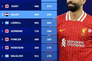 體育資訊4月11日訊 利物浦官方宣布與薩拉赫完成續(xù)約。德轉(zhuǎn)也盤點(diǎn)了利物浦隊(duì)史射手榜,其中薩拉赫位列第三位,以下為具體榜單: