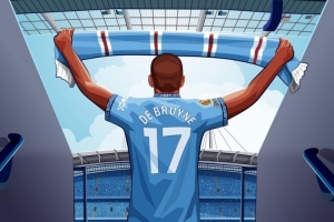 曼城官方社媒曬出海報,內(nèi)容為身穿德布勞內(nèi)球衣的球迷舉起曼城圍巾。
