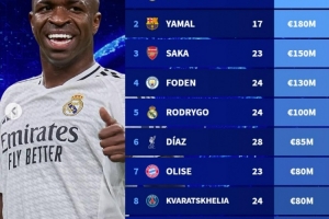 體育資訊4月12日訊 德轉盤點了世界邊鋒球員身價榜,其中維尼修斯2億歐居首,亞馬爾次席,以下為具體榜單: