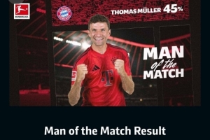 德甲官方宣布,穆勒在投票中獲得45%球迷支持,戰(zhàn)勝奧利塞(20%)和科貝爾(19%)等球員,當(dāng)選本場(chǎng)比賽最佳球員。