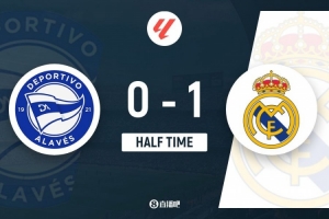 上半場(chǎng)比賽結(jié)束,十人皇馬客場(chǎng)暫時(shí)1-0領(lǐng)先阿拉維斯。