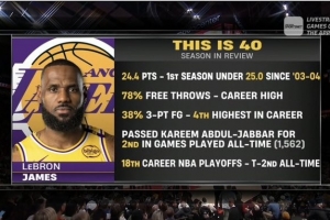 出戰(zhàn)場(chǎng)次超越賈巴爾升至歷史第二(1562)