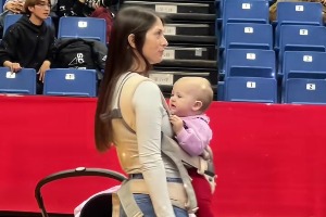 體育資訊01月10日訊 天津隊(duì)比賽賽后,天津外援大衛(wèi)-詹姆斯的妻子帶著孩子陪伴丈夫一起下班。