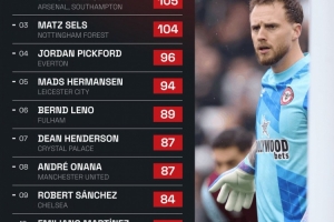 體育資訊4月15日訊 Squawka統(tǒng)計(jì)了本賽季英超撲救次數(shù)排行榜,弗萊肯位列第1,奧納納第8。