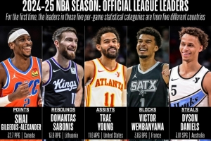 本賽季場均得分、籃板、助攻、蓋帽和搶斷五項(xiàng)數(shù)據(jù)領(lǐng)先者分別來自五個(gè)不同的國家,聯(lián)盟歷史首次!