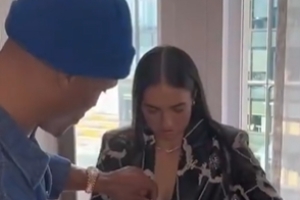喬治亞-阿穆?tīng)柹缑綍癯隽俗约哼x秀夜所穿的衣服,這套衣服由威少的個(gè)人品牌Honor the Gift提供,并由威斯布魯克親自設(shè)計(jì)。在視頻中威少還體貼地幫阿穆?tīng)栒砹艘幌骂I(lǐng)口。