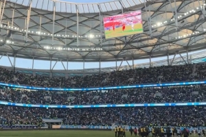 本場比賽共計58619名球迷來到梭魚灣現(xiàn)場觀賽。賽后,近6萬名球迷將梭魚灣營造成了演唱會現(xiàn)場,合唱起了《大海啊故鄉(xiāng)》。