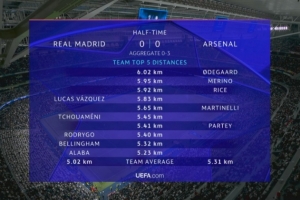 全隊(duì)跑動(dòng):皇馬5.02km 阿森納5.31km