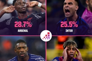 Opta超級計算機更新了對歐冠奪冠概率的預測,阿森納28.7%、國米25.5%、巴黎24%、巴薩21.8%。