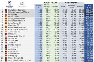 體育資訊04月17日訊 歐冠1/4決賽結束,數據媒體football meets data更新了本賽季的歐冠獎金排名,其中巴黎以1.194億歐躍居榜首,國米、阿森納、巴薩分列二三四位。