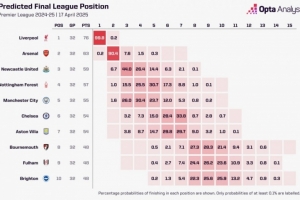 體育資訊4月17日訊 Opta超級計算機預(yù)測了英超各隊排名概率,利物浦奪冠概率99.8%。