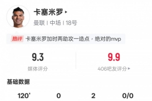 體育資訊4月18日訊 歐聯(lián)杯1/4決賽次回合,曼聯(lián)加時5-4里昂,總比分7-6晉級。本場比賽卡塞米羅首發(fā)出戰(zhàn),1次造點,貢獻2次助攻,送出4次關(guān)鍵傳球,評分9.3全場最高。