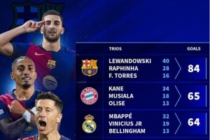1、巴薩:萊萬(wàn)(40球)+拉菲尼亞(28球)+費(fèi)蘭(16球):84球