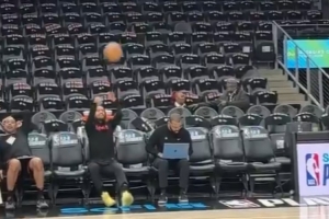 賽前熱身環(huán)節(jié),老鷹球星特雷-楊坐在替補席,隨手一甩皮球空心入網(wǎng),展現(xiàn)了不俗的力量和手感。
