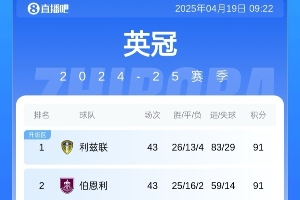 體育資訊04月19日訊 英冠第43輪戰(zhàn)罷,利茲聯(lián)、伯恩利91分排名前二。