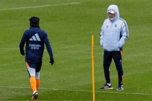身披羽絨服的安切洛蒂一反常態(tài),獨(dú)自一人徘徊在場地邊緣,兜帽與棒球帽幾乎將他隱藏起來。開場階段安帥僅與技術(shù)團(tuán)隊(duì)進(jìn)行了兩分鐘簡短交流后,他便始終低著頭踱步,