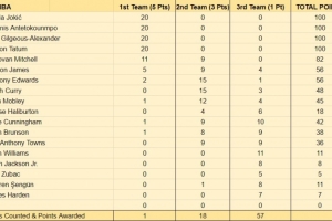 目前流出的20位投票者,約基奇、亞歷山大、字母哥和塔圖姆,在最佳陣容投票上都獲得了全票。