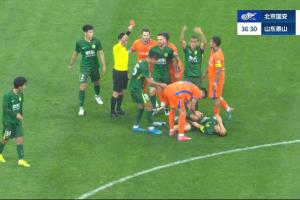 第37分鐘,澤卡踩中王剛腳后跟!主裁唐順齊果斷出示紅牌將前者罰下,泰山只剩9人應(yīng)戰(zhàn)!