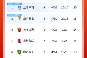 體育資訊04月19日訊 中超第8輪,申花2-0三鎮(zhèn),國(guó)安6-1泰山,目前中超積分榜上,申花4分領(lǐng)跑,下輪將與泰山直接交手。